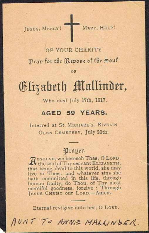 The younger sister Elizabeth died first in 1917 at the age of 59 years old at76 Woodstock Road. Ann died a year later in 1918 aged 63 years old at 63 Southgrove Road. They are buried at St Michaels Cemetery in family grave 104 with their parents and some siblings. On the funeral card is written "Aunt to Anne Mallinder", where "Anne" is the sister of my grandfather Thomas (1886-1943) and grandmother to Trish.