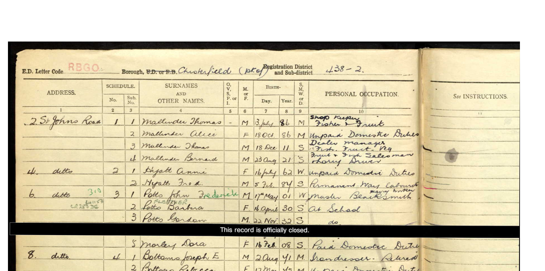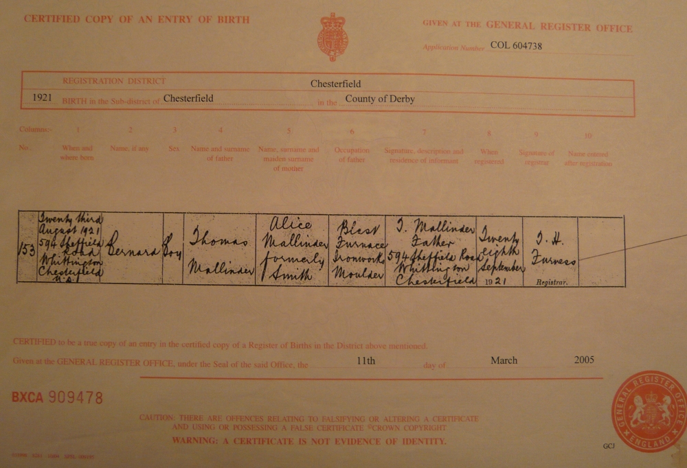 The birth certifcate records Bernard being born 23rd August 1921 at 594 Sheffield Road, Whittington, Chesterfield, Derbyshire. His father is recorded as Thomas Mallinder and his mother is recorded as Alice Mallinder formerly Smith. Occupation of father is recorded as 'blast furnace ironworks moulder'.