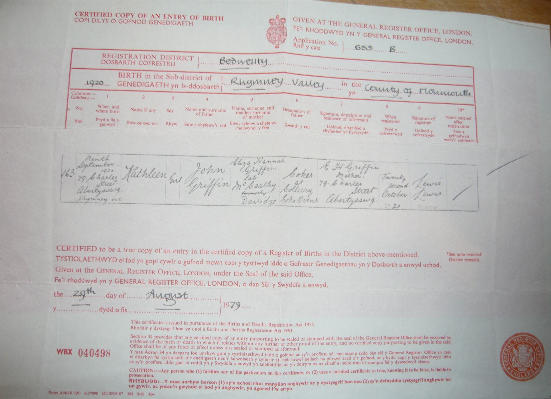 The birth certificate records Kathleen's birth as 9th September 1920 at 79 Charles Street, Abertysswg, Rhymney Valley, County of Monmouth, Wales. A view of the road Kathleen played in with her house on the left side. The name of father recorded as John Griffin (his previous surnames were O'Toole and Twohill) and Mother as Eliza Hannah Griffin, late McCarthy formerly Davidge. The occupation of father recorded as Coker at Colliery Coke Ovens.