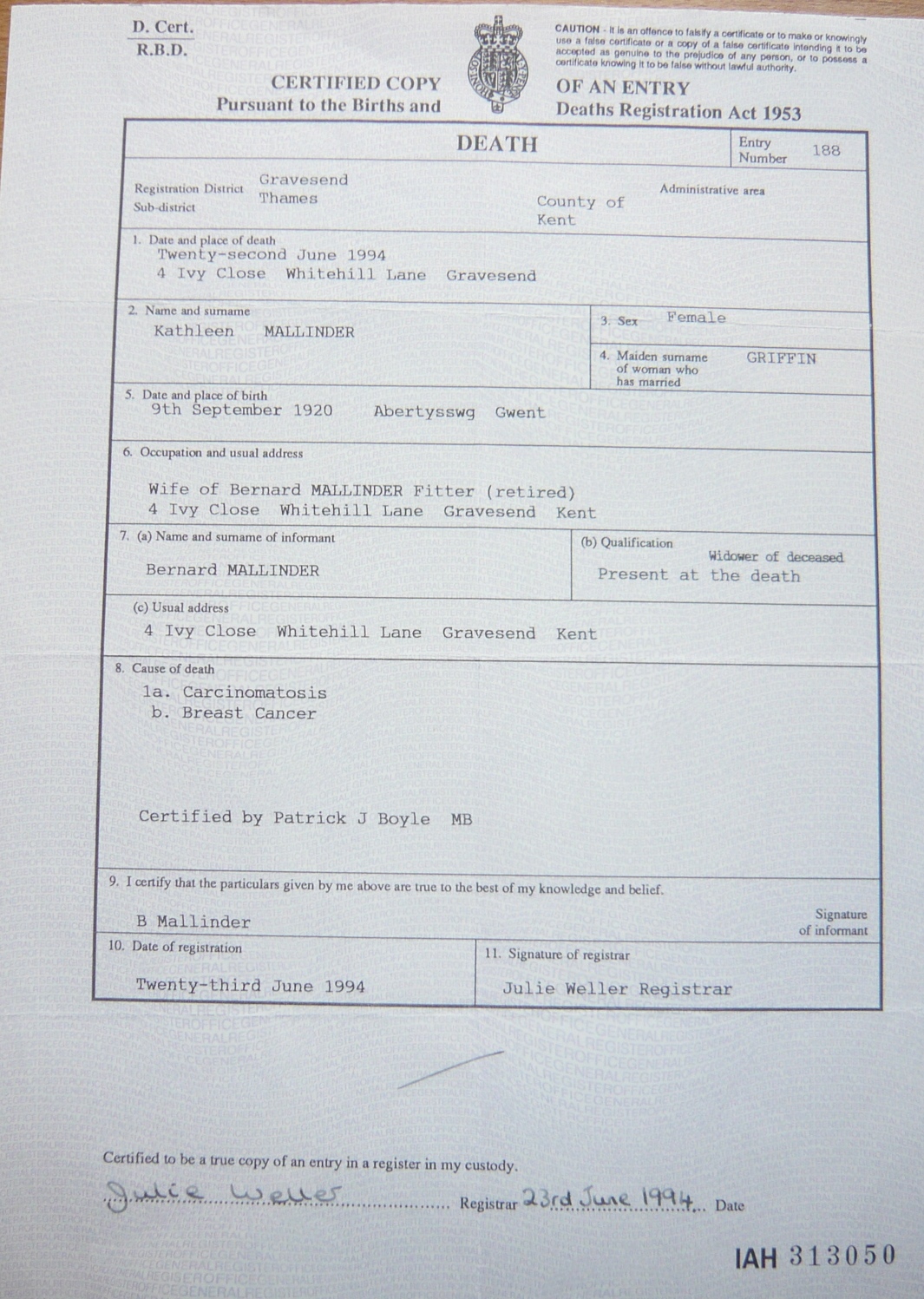The death certificate records Bernard's death 23rd October 1995 at Joyce Green Hospital Dartford. His cause of death was Carcinomatosis. The grave is located at Northfleet Cemetery situated on Springhead Road; buried with his wife Kathleen.