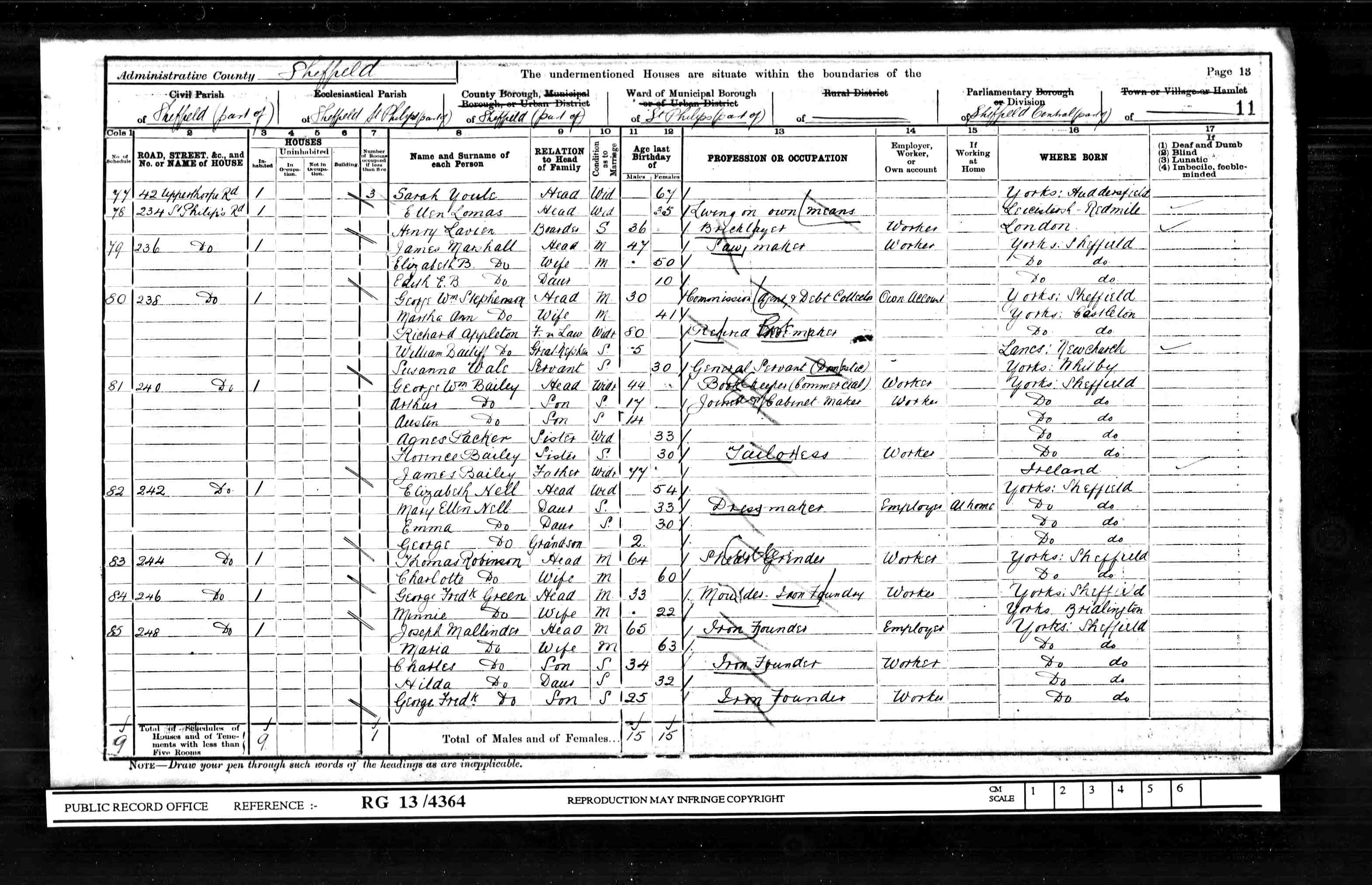 Within my family oral tradition is recorded the Mallinders having their own iron foundry business in Sheffield. This oral tradition was passed on to me from my father. The written record confirms this oral tradition. The "Mallinder Brothers" iron foundry company traded from after 1861 (unknown start date) until 1883. Thomas Mallinder (Paternal Line) with his brothers established the business.