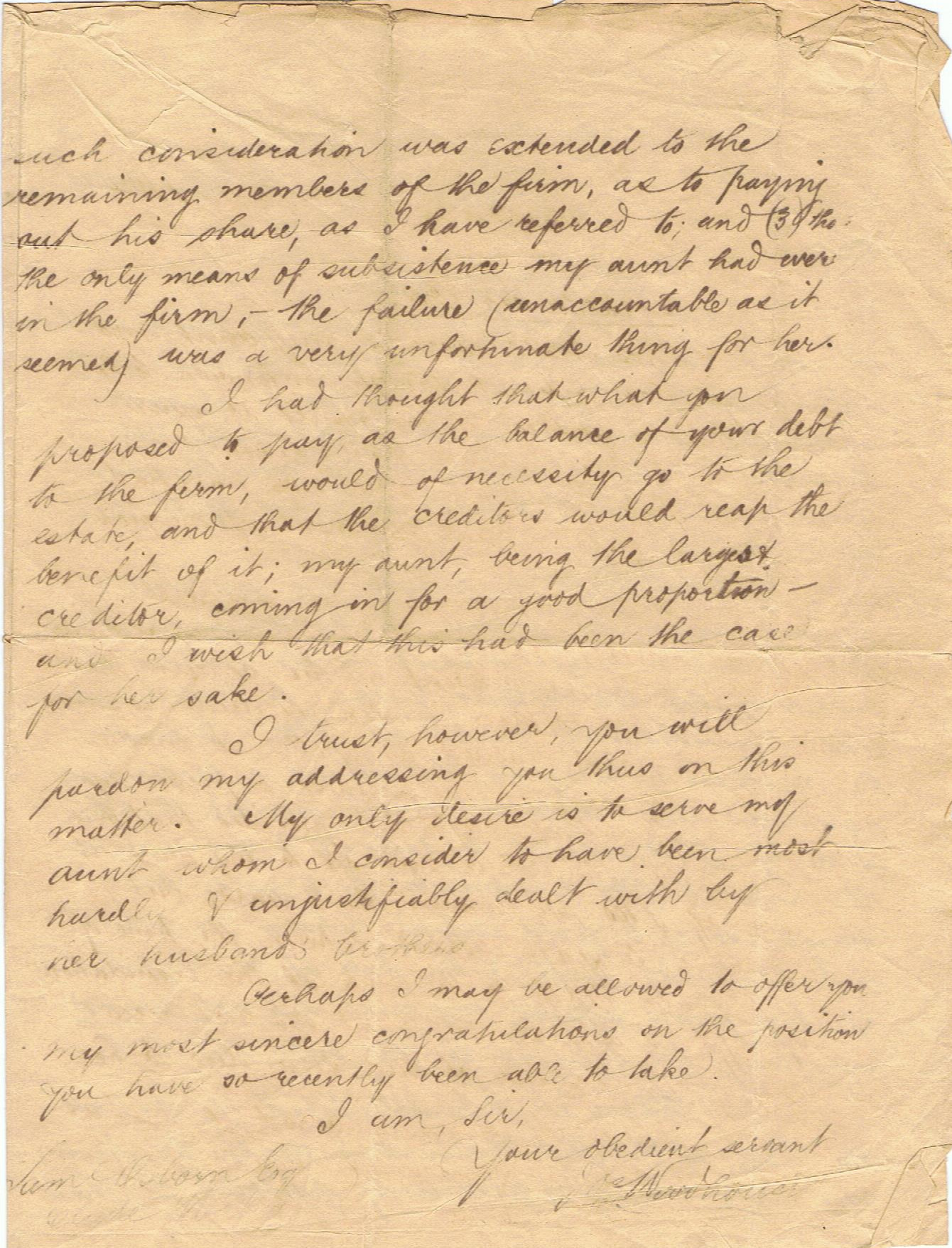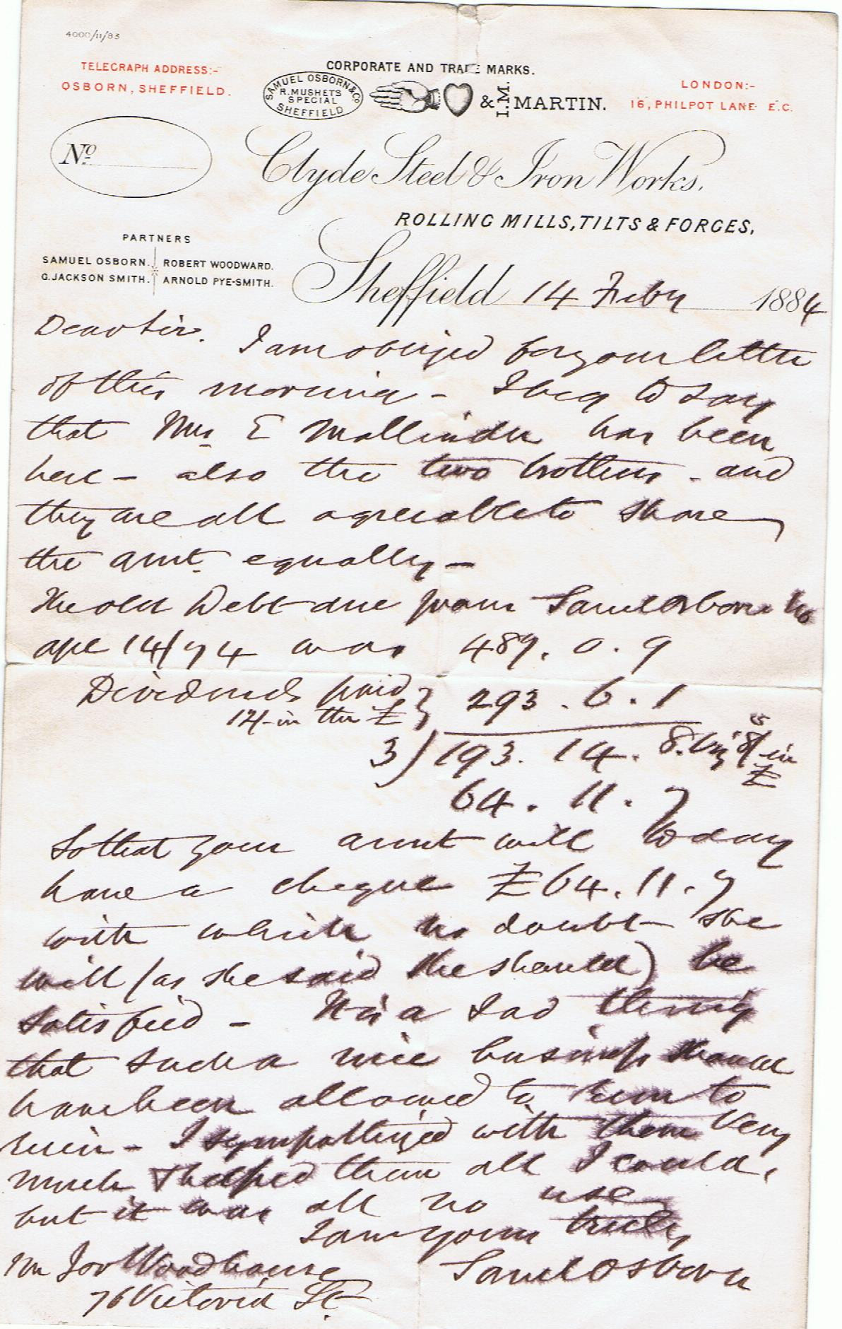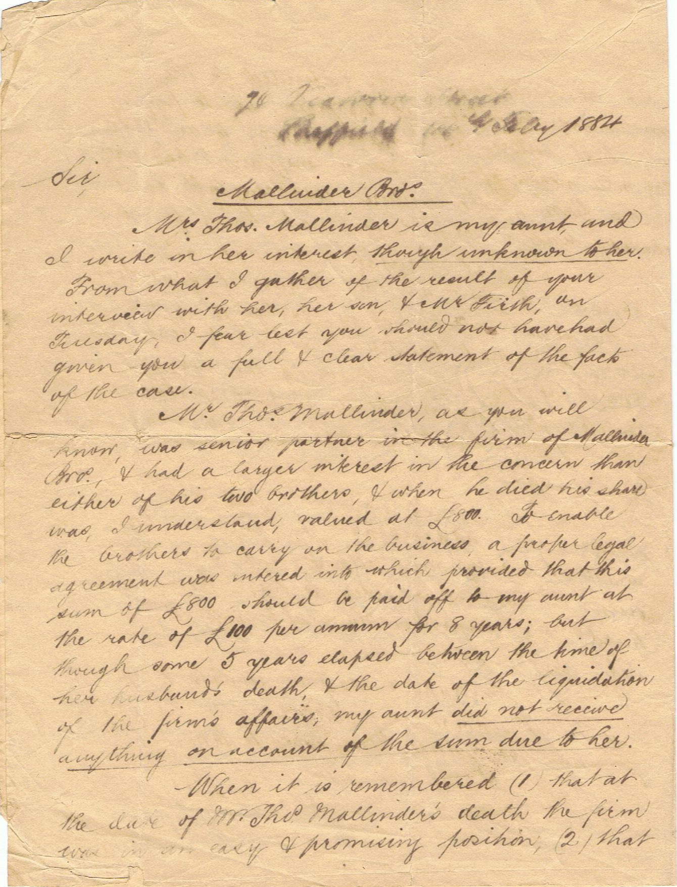 In November 2014 I received two original documents connected to this iron foundry, from Patricia Nixon, that revealed further information. The first document was a two page letter from the niece of Elizabeth Mallinder nee. Crossland to the solicitors handling the bankrupty of Francis and John. The first page explained that Thomas was the senior partner of the business and that when he died his share in the "Mallinder Brothers" had been undervalued. It is claimed that Thomas had a larger share than Francis or John. The claim was that on Thomas Mallinder's death an agreement had been made by Francis and John to pay Elizabeth (Thomas's wife) £800 at a £100 per year for eight years. The issue was that Francis and John had paid her nothing.