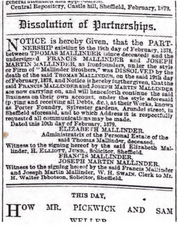 On January 16th 1883, it is recorded in 'The London Gazette' that Joseph Mallinder (of 176 St. Mary's Road, Sheffield) and Francis Mallinder (late of 31 Randall Street but now of 164 Alexandra Road, Heeley, Sheffied) filed for bankruptcy. They were operating in business as a partnership at Porter Foundry, Sylvester Gardens, Arundel Street in Sheffield. The firm was called "Mallinder Brothers" and listed as General Ironfounders. The purpose of this publication was to publically inform debtors to Mallinder Brothers that they needed to pay their debts; Septimus Short of Sheffield was appointed as Trustee of the debtors.