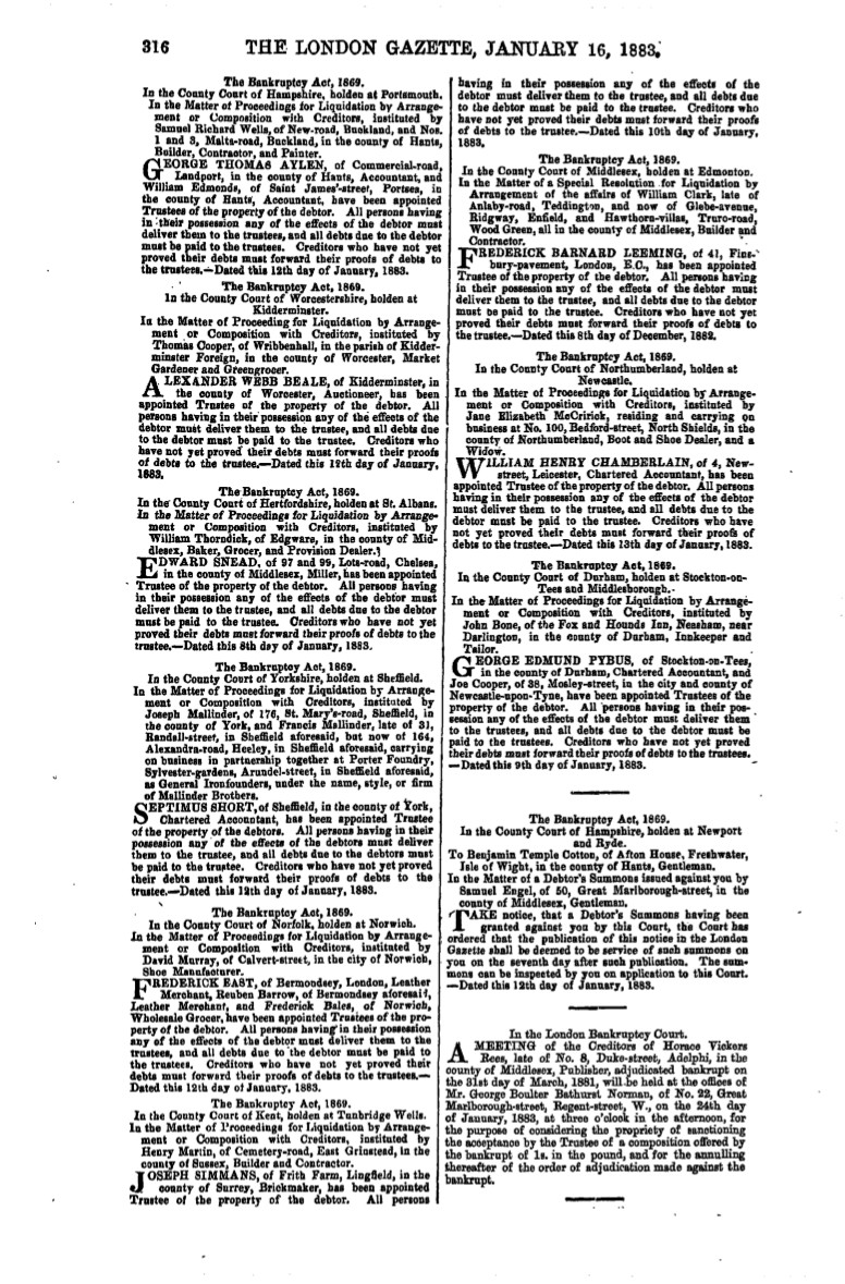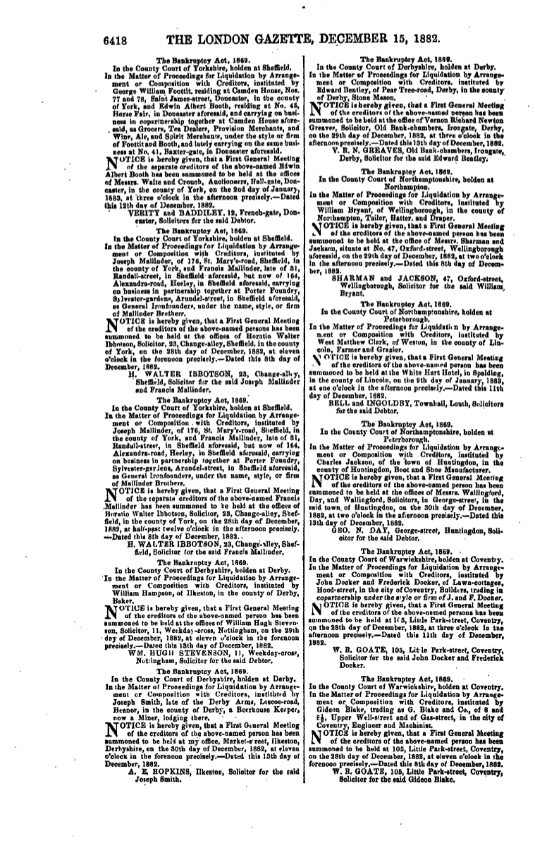 'The London Gazette' on December 15th 1882 published the bankruptcy details for Joseph and Francis Mallinder. The legal requirement was to publish within 'The London Gazette' a 'notice' to all creditors of the company filing for bankruptcy under the 1869 Act. This announcement was to inform all creditors that a First General Meeting was to be held at the offices of Horatio Walter Ibbotson; solicitor for Francis and Joseph Mallinder.