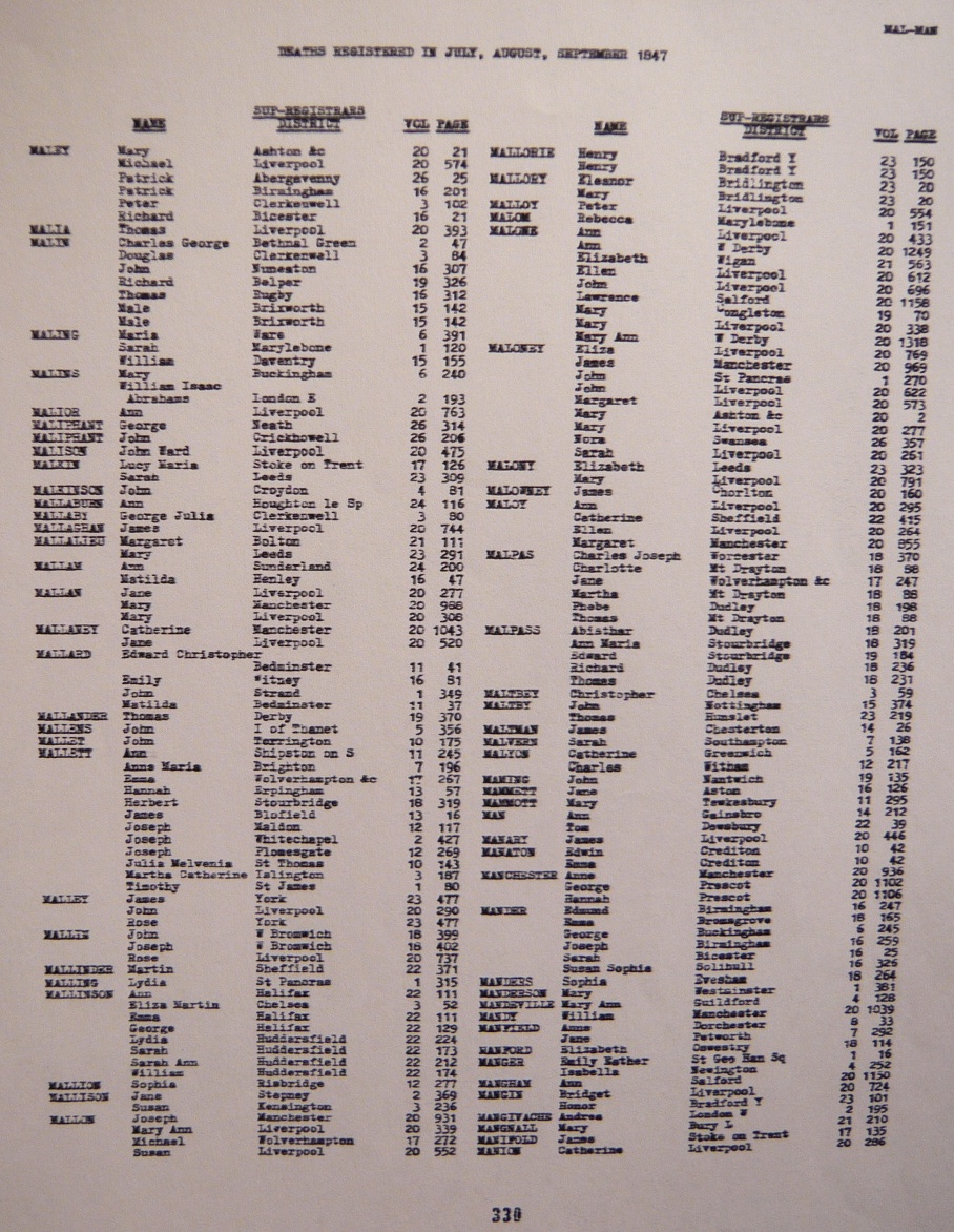 July 2nd 1847 at Sheffield, Vol 22 Page 371, aged about 44 years old. There is a burial on the 4th July 1847 for Martin Mallinder aged 44 of Granville St at St John's Park District. There is a floor tiling memorial, to the far left aisle of the main atrium, at St Maries Cathedral in Sheffield. The tiles were made about 1880 asking for prayers for a fair number of deceased parishioners; see here for a detailed explanation on the tiles.