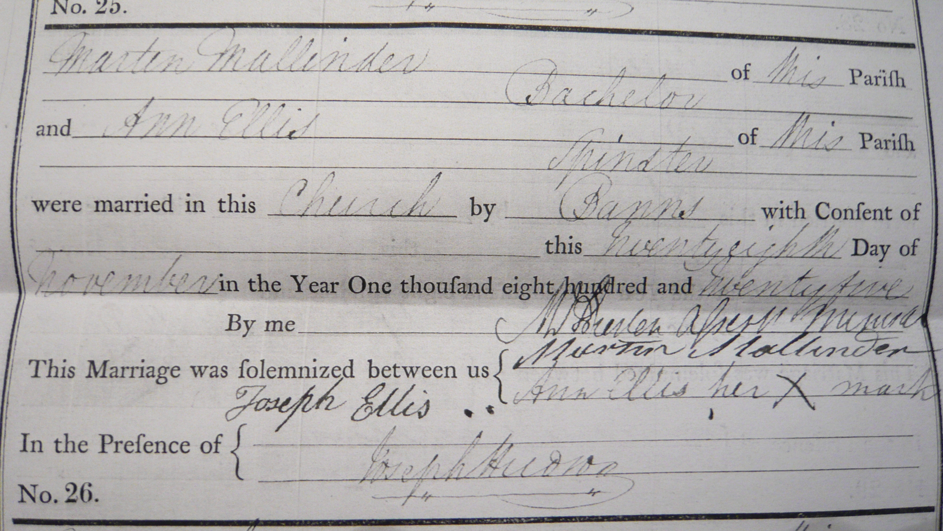 Martin Mallinder married Ann Ellis on 28th November 1825. Joseph Ellis and Joseph Hudson are recorded as witness, Martin Mallinder's signature is present and Ann Ellis signs with an X (looking at other entries it seems that signing with an X was common practice for the bride). Martin probably became a Catholic when he married Ann, the exact location of the Catholic sacramental marriage is unclear at this stage, probably at Ann's parish in Spinkhill.