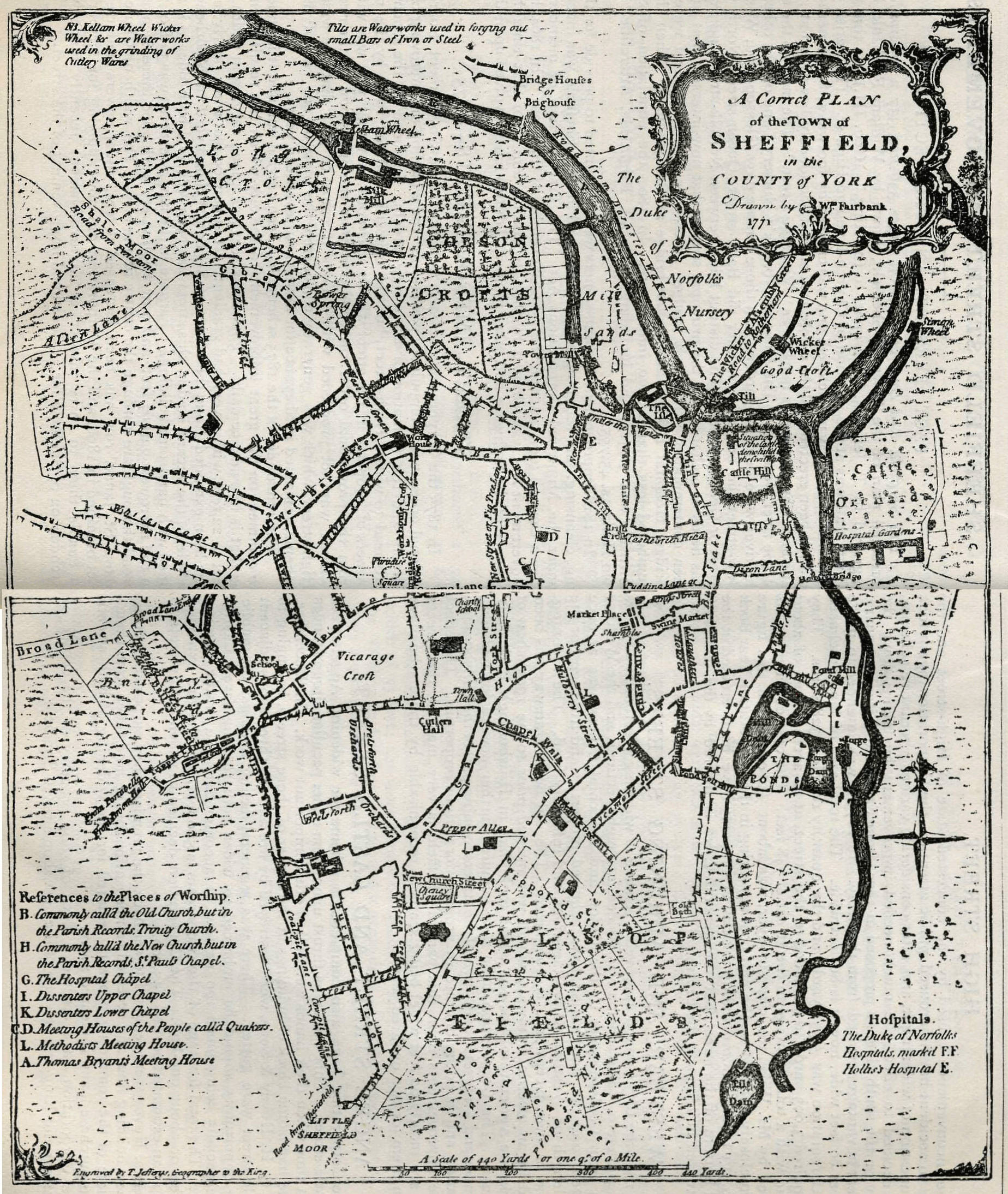 Above is a map of Sheffield in 1771, the world that Thomas knew. In the top right hand corner of the map it states, “A Correct Plan of the Town of Sheffield in the county of York 1771”. Killamarsh at this time was a farming community and only later in the 19th century became a mining town. The Chesterfield Canal was built between 1771 and 1777 and Thomas would have been fully aware of this. This canal was the main transport mechanism for moving coal, stone and grain around.