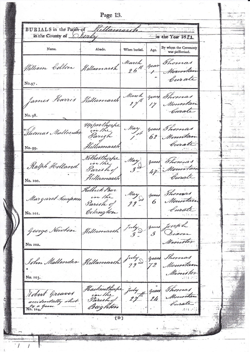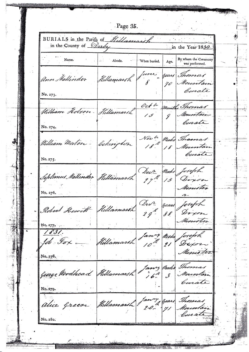 Ann Mallinder was buried June 8th age 70 years. At the time of death her abode was Killamarsh.