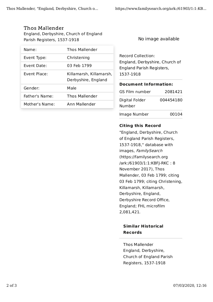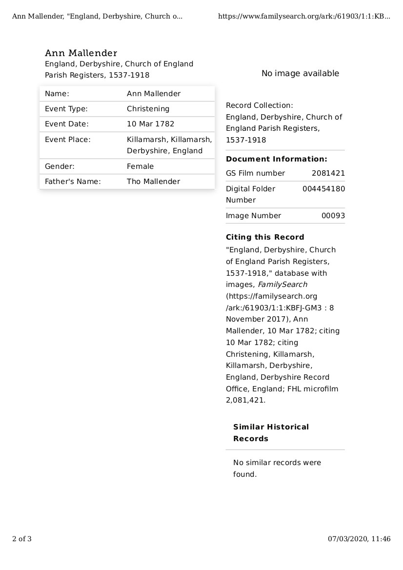 Ann Mallinder, C. 10th March 1782, IGI Batch 7225812, sheet 97, source call 0822042. Ref: Christening, Killamarsh, Killamarsh, Derbyshire, England, Record Office, Matlock; FHL microfilm 2081421