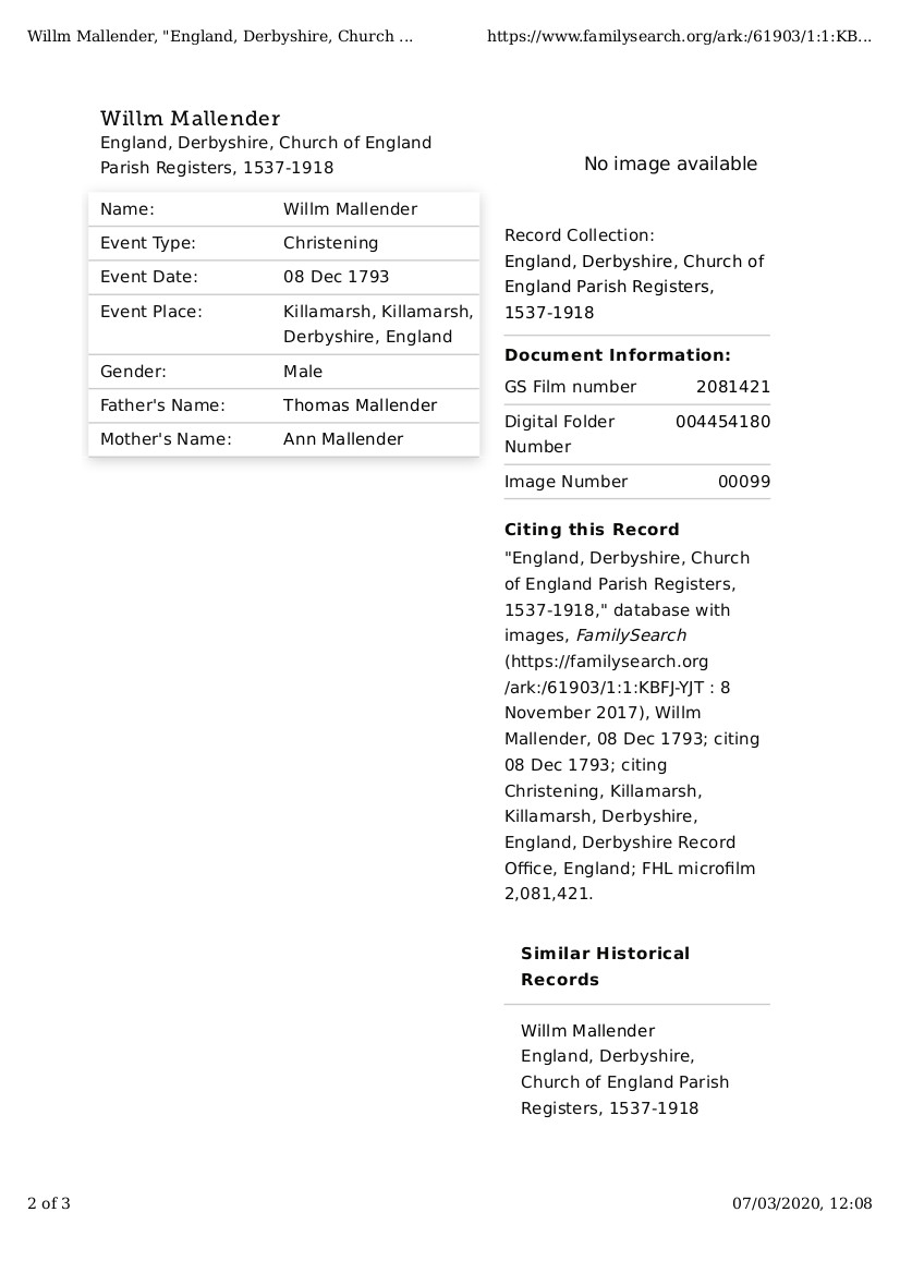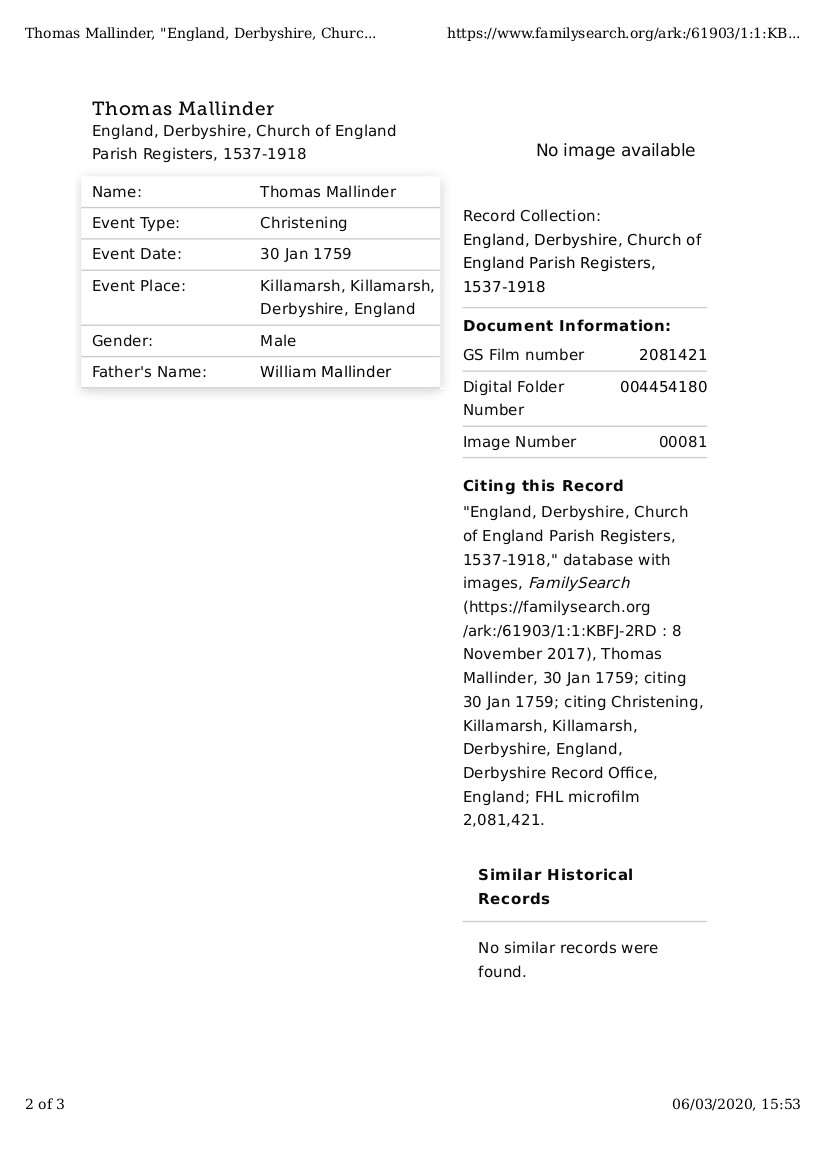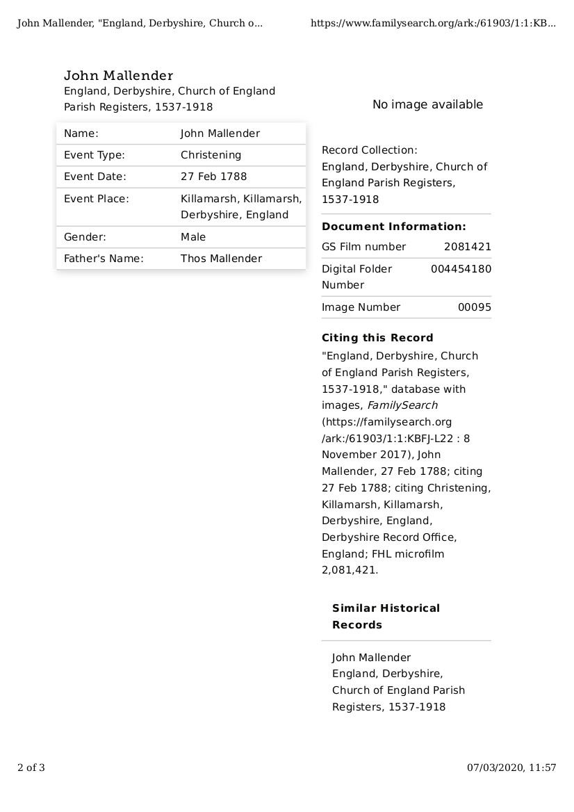 John Mallinder, C. 27th Feb 1788, IGI Batch 7225812, sheet 98, source call 0822042. Ref: Christening, Killamarsh, Killamarsh, Derbyshire, England, Record Office, Matlock; FHL microfilm 2081421. See https://www.familysearch.org/ark:/61903/1:1:KBFJ-LJZ
