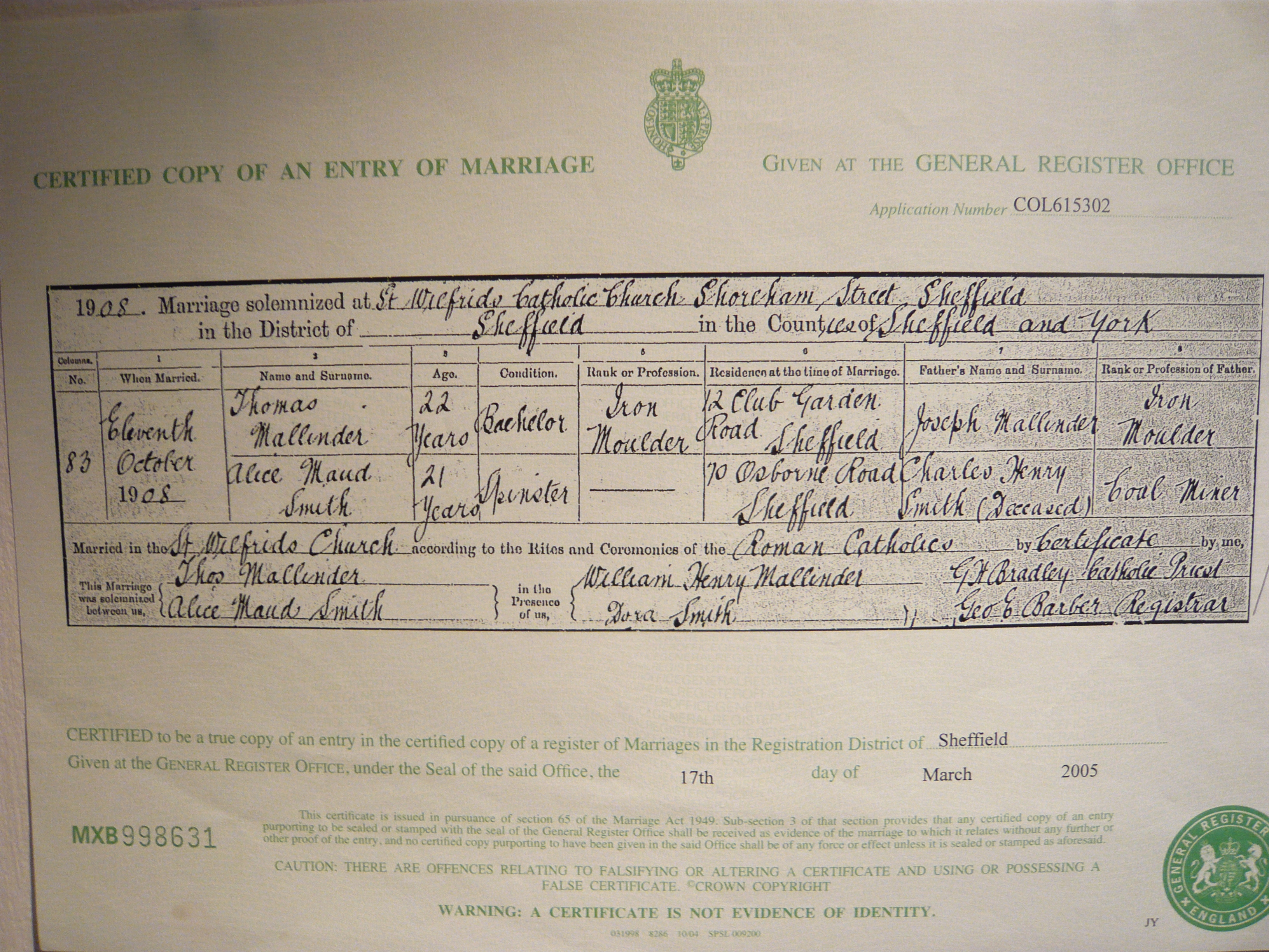 Thomas was married 1908 11th October at St Wilfrids Catholic Church, Shoreham Street, Sheffield.. Thomas is recorded as 22 years old, a bachelor and occupation as iron moulder; living at 12 Club Garden Road, Sheffield. His father is recorded as Joseph Mallinder who was also an iron moulder. His wife is recorded as Alice Maud Smith age 21 years old and a spinster. Alice was living at 70 Osborne Road in Sheffield; her father is recorded as Charles Henry Smith (deceased) whose occupation was a coal miner. The witness' to the marriage were Dora Smith and William Henry Mallinder.