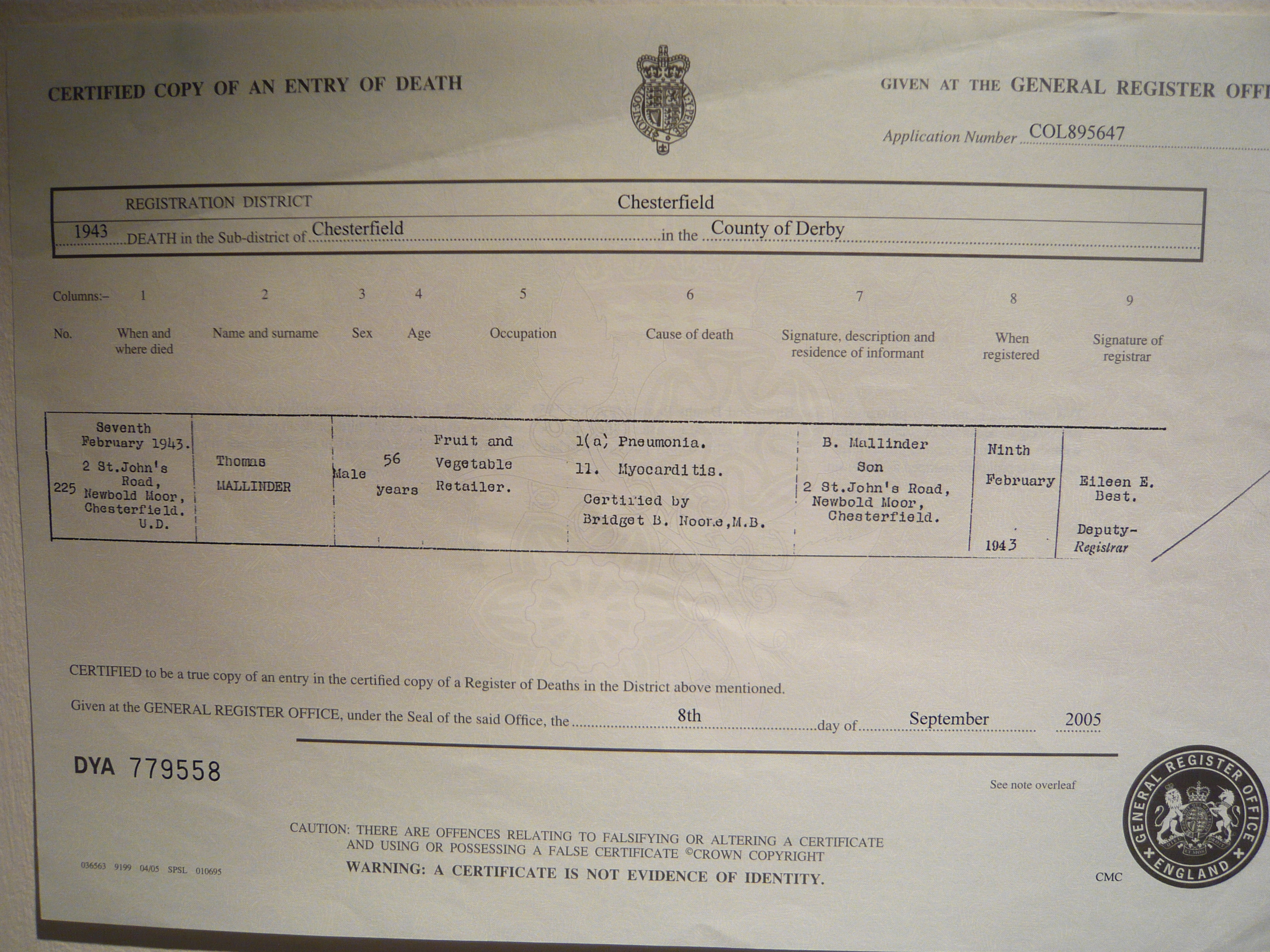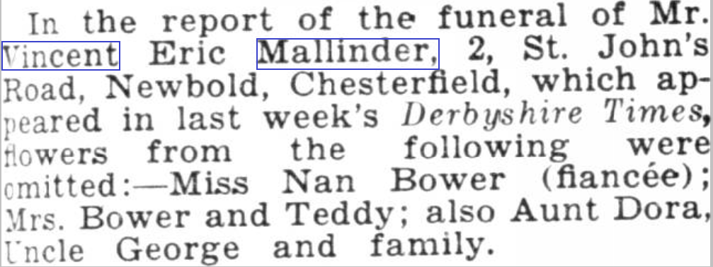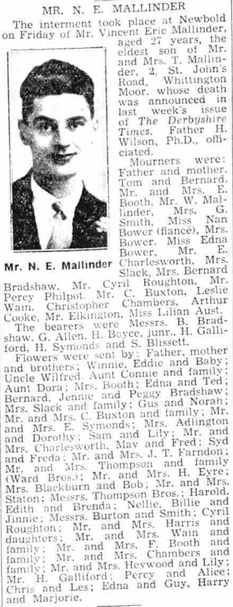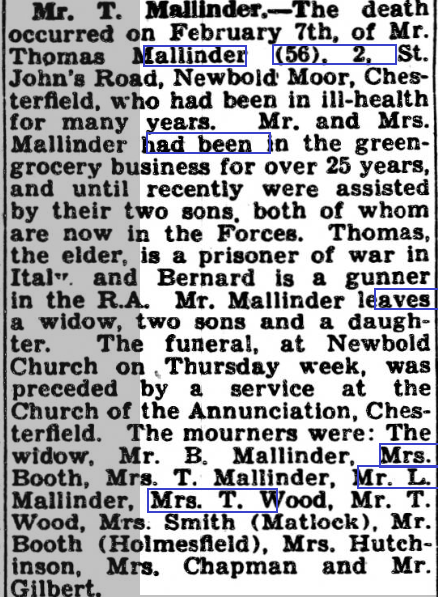 Thomas died 7th February 1943 at 2 St. John's Road, Newbold Moor, Chesterfield, Derbyshire. His occupation at time of death was a fruit and vegetable retailer. The primary cause of death was pneumonia, the secondary cause was myocarditis; an inflammation of the heart muscle caused by an infection. My father Bernard Mallinder registered the death. Thomas was buried at St. John the Evangelist, Littlemoor, Newbold, Derbyshire. In this grave is also buried his wife Alice who died 16 Feb 1947; fours years after Thomas. The grave also holds Vincent Eric who was Thomas’s first son and died 3rd Nov 1936.