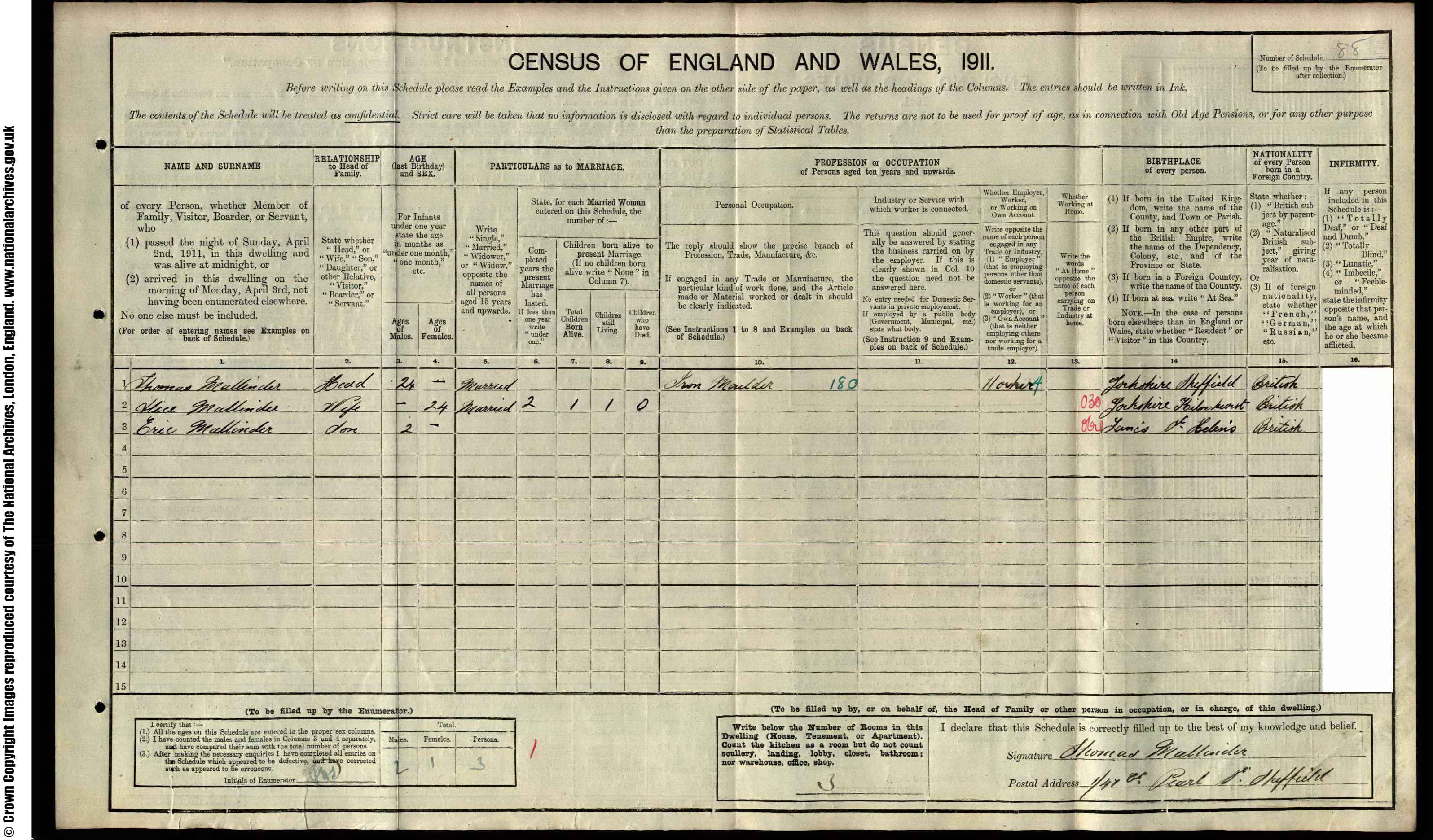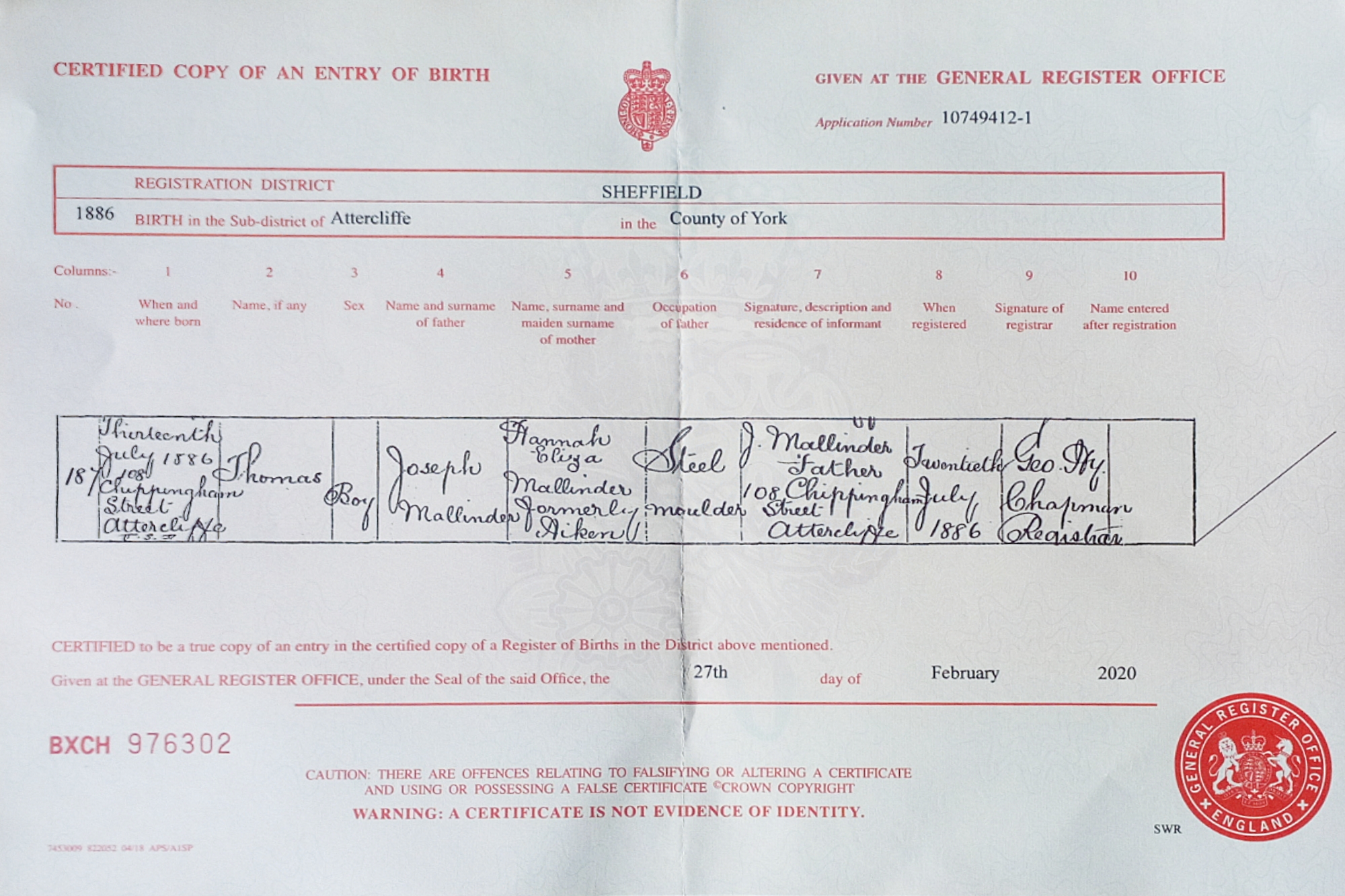 Thomas was born 13th July 1886 at 108 Chippingham Street, Attcliffe, Sheffield, Yorkshire. His father is recorded as Joseph Mallinder and his mother is recorded as Hannah Eliza Mallinder formerly Aiken. His father is recorded as a steel moulder.