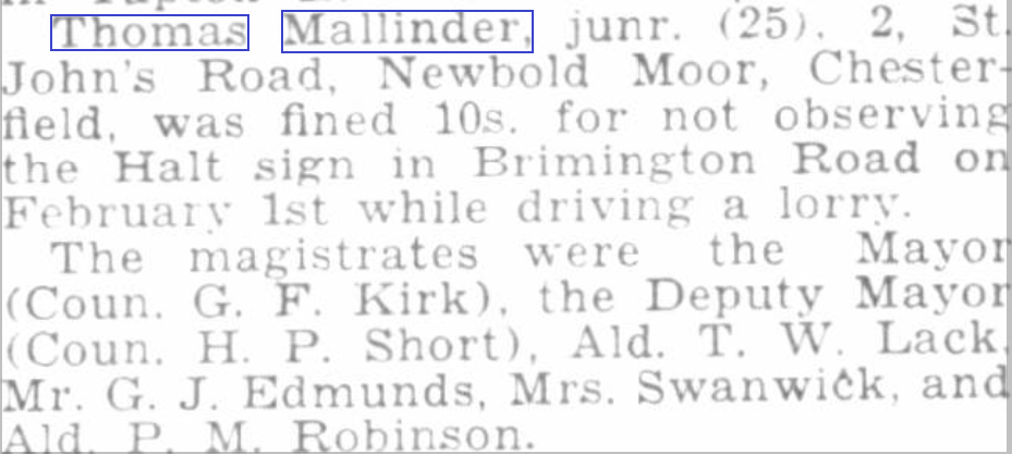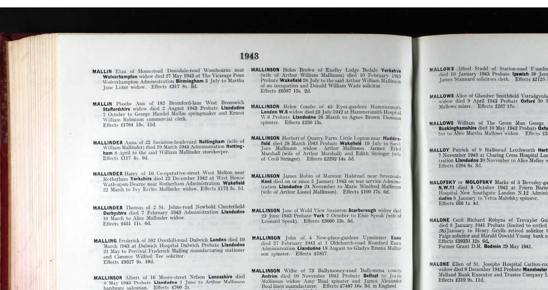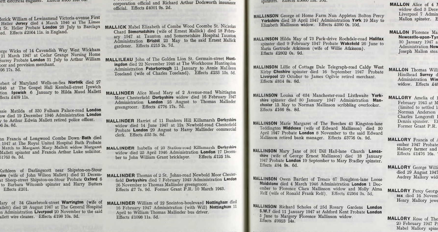On the death of Alice Mallinder in 1947, probate was granted to her son Thomas Mallinder on 25th August 1947 for £776 17s 7d. There was a further grant of probate to the Thomas Mallinder 1943 probate. This was granted to Thomas (son of Thomas and Alice) for £7 7s 9d, someting must have been overlooked from the original 1943 probate grant.