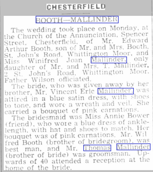 Winifred J Mallinder b. 1914 d. 19XX m. 1935. Winifred married Edward Booth in 1935. They had three children. Maureen born 1935 then Patricia was born in 1937 and Josephine was born in 1946.
