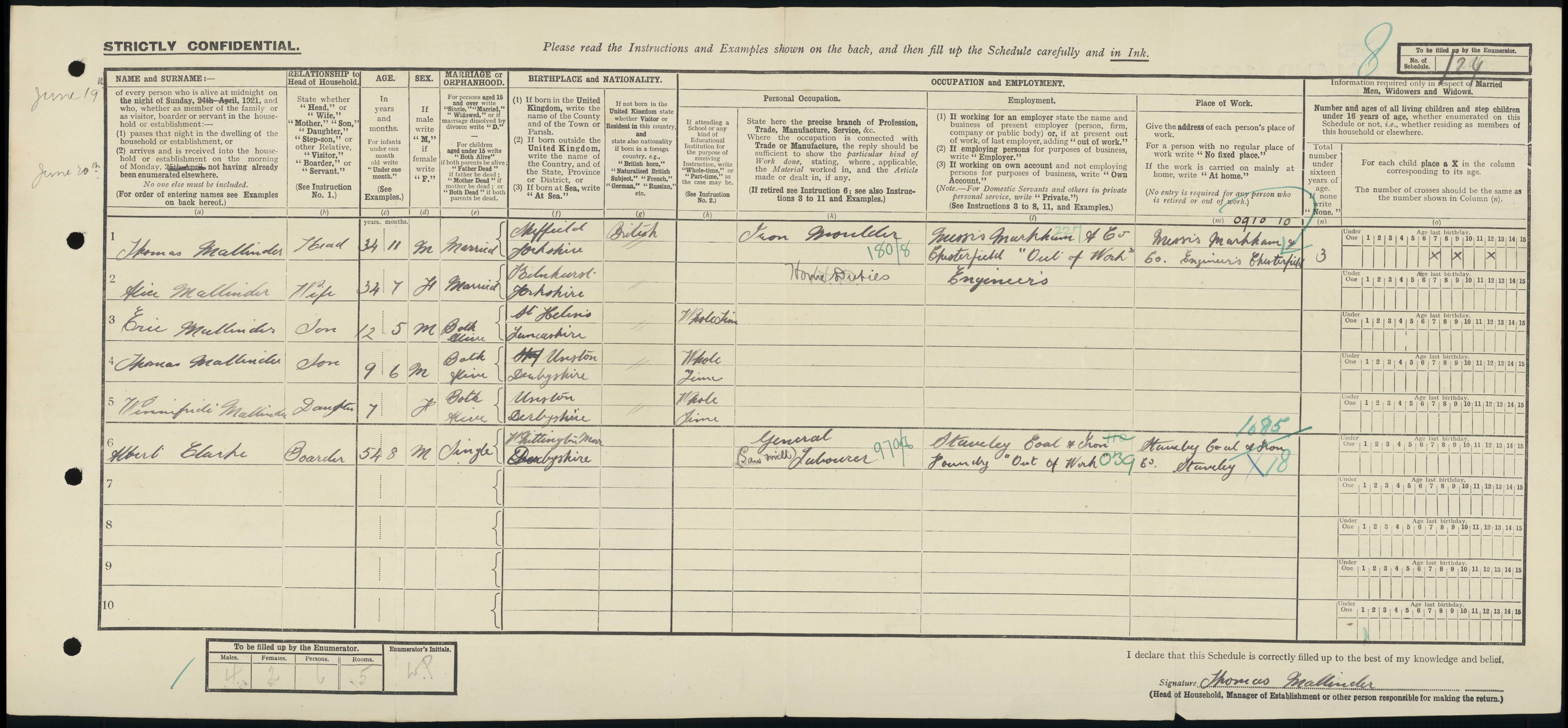 The 1921 census records that Thomas was 34 years old and married to Alice with a son Eric aged 12 years, a son Thomas aged 9 and a daughter Winifred aged 7. His occupation is listed as an iron moulder "out of work" but previously working for Messrs Markham & Co Chesterfield Engineers. They were living at Sheffield Rd, Whittington, Moor, Chesterfield. Markham & Company of Chesterfield employed 46 people in 1921.