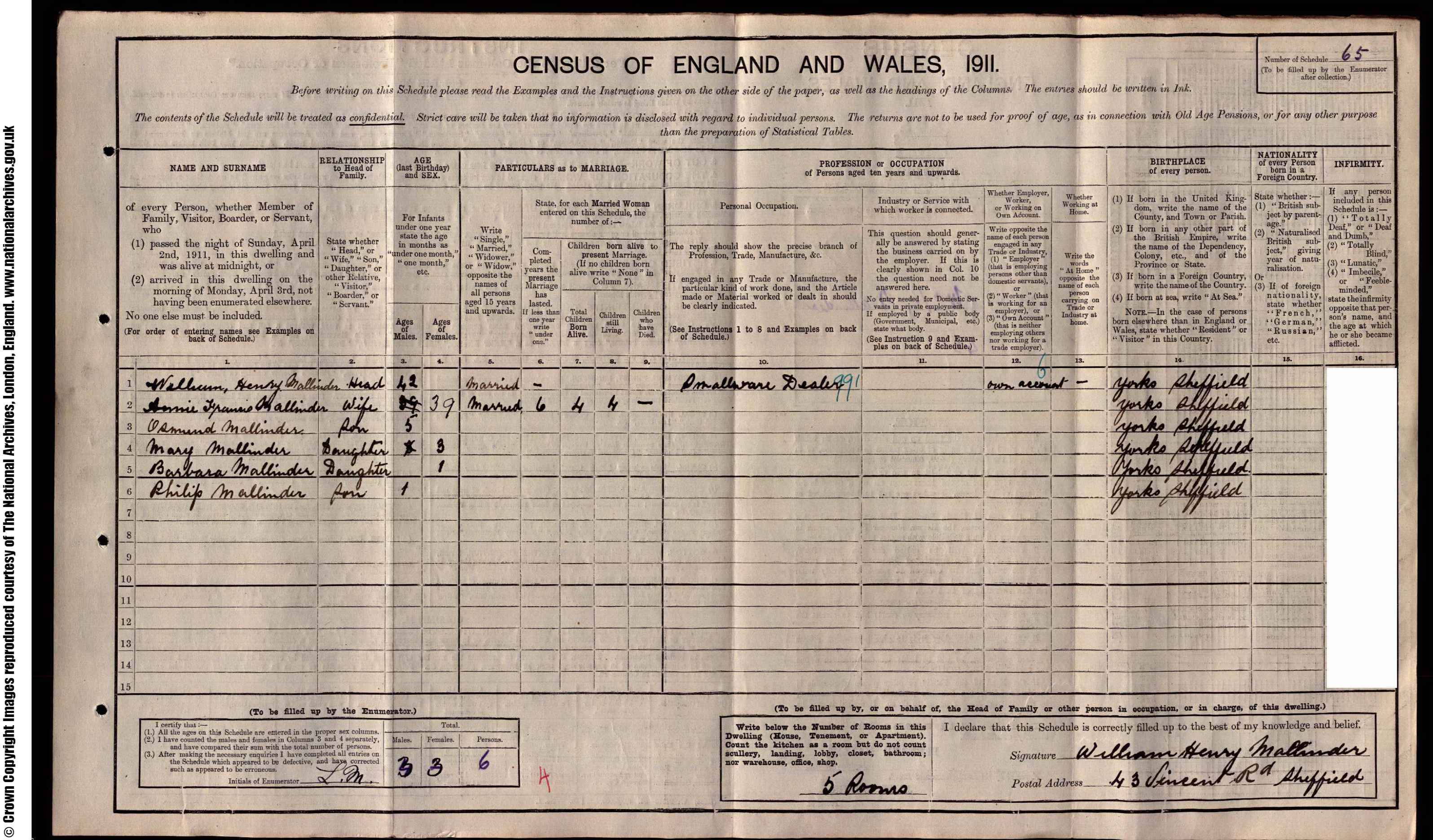 In 1911 William Henry is recorded as 42 years, living at 43 Vincent Road in Sheffield, a smallware dealer, own account. His wife Annie Francis is recorded as 39 years and has four children recorded.