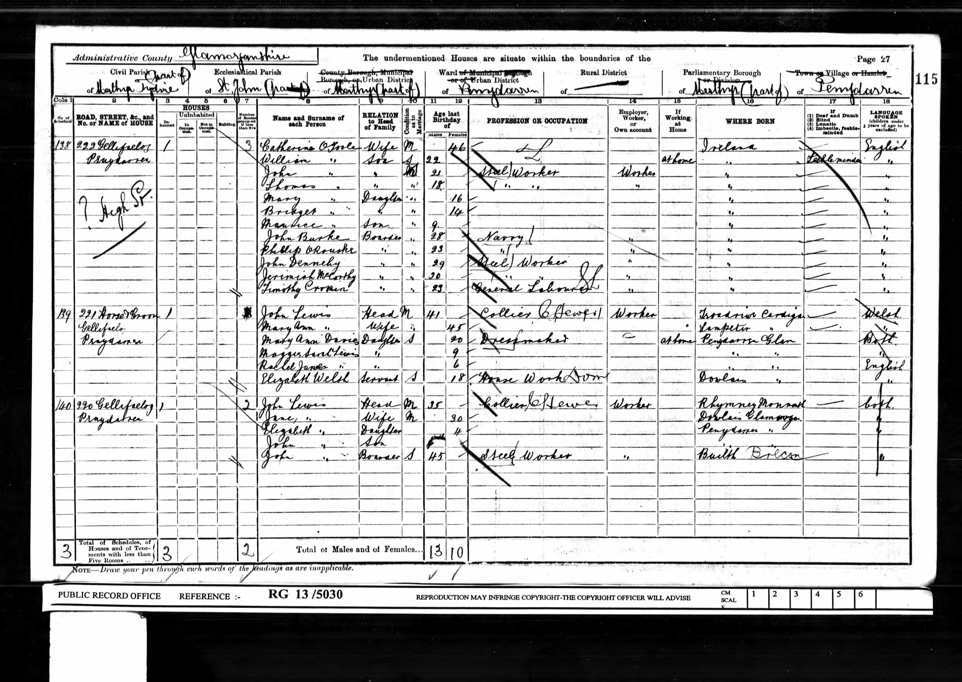 The 1901 census was a household census taken on the night of Sunday 31 March 1901. The 1901 census records that John Griffin is living at, Ecclesiastical parish St John, 222 Gellifaelog, in the town of Penydarren, Merthyr Tydfil, Glamorgan, Wales.