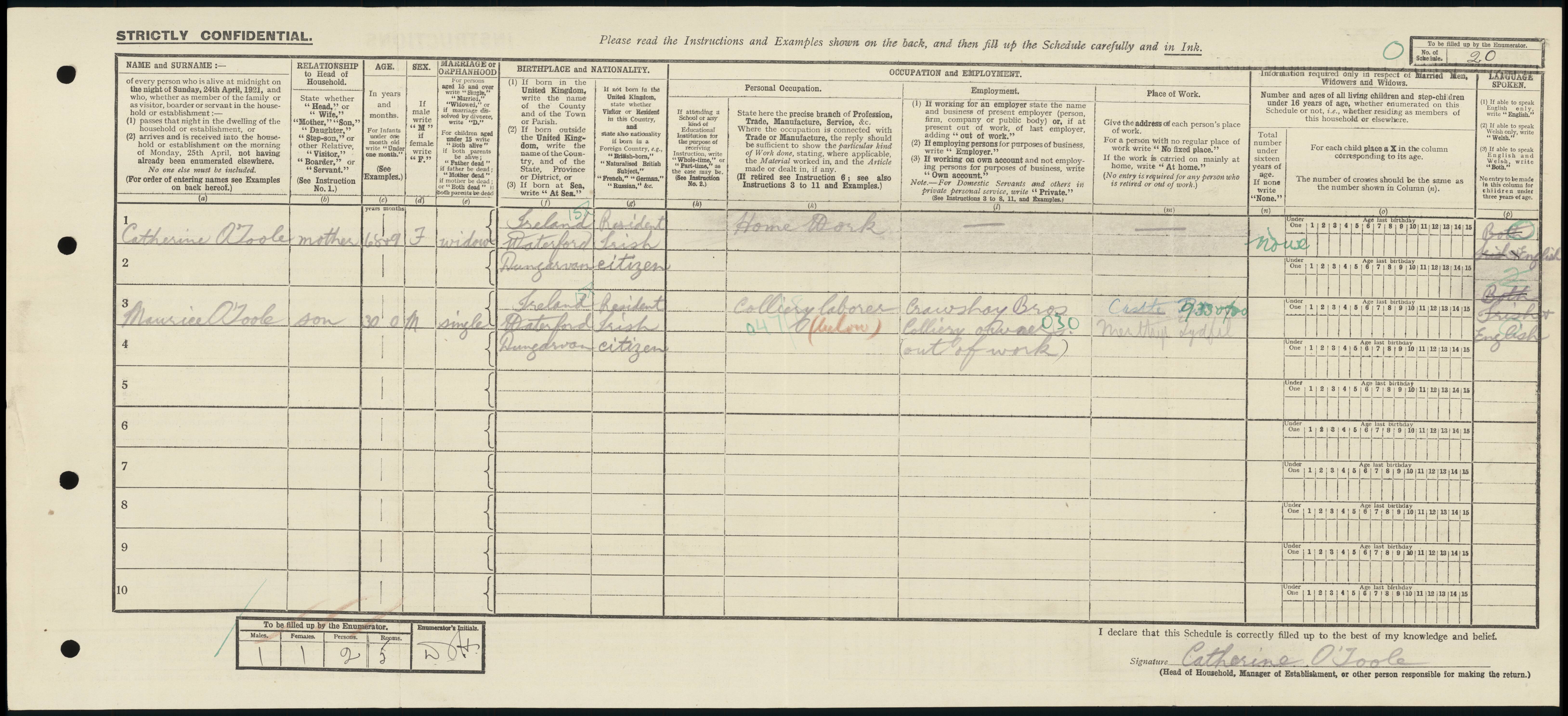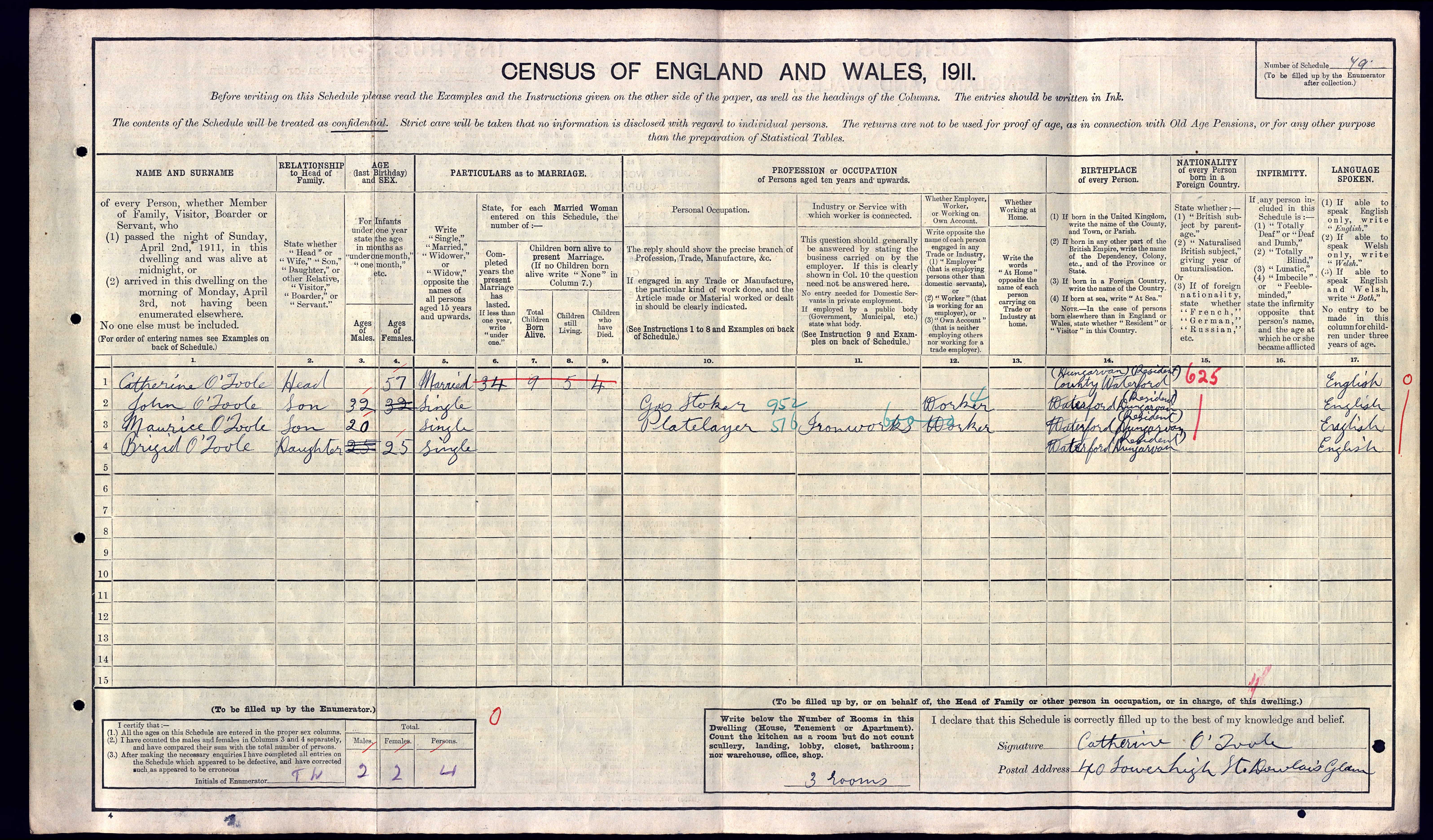Her son John (grand father) was recorded as 32 years old, single, a gas stoker and his birthplace is listed as Waterford (resident Dungarvan). Her son Maurice was was recorded as 20 years old, single, a Platelayer in the Ironworks industry and the same birthplace as his mother and siblings. Her daughter Brigid was recorded as 25 years old, single and no occupation recorded.
