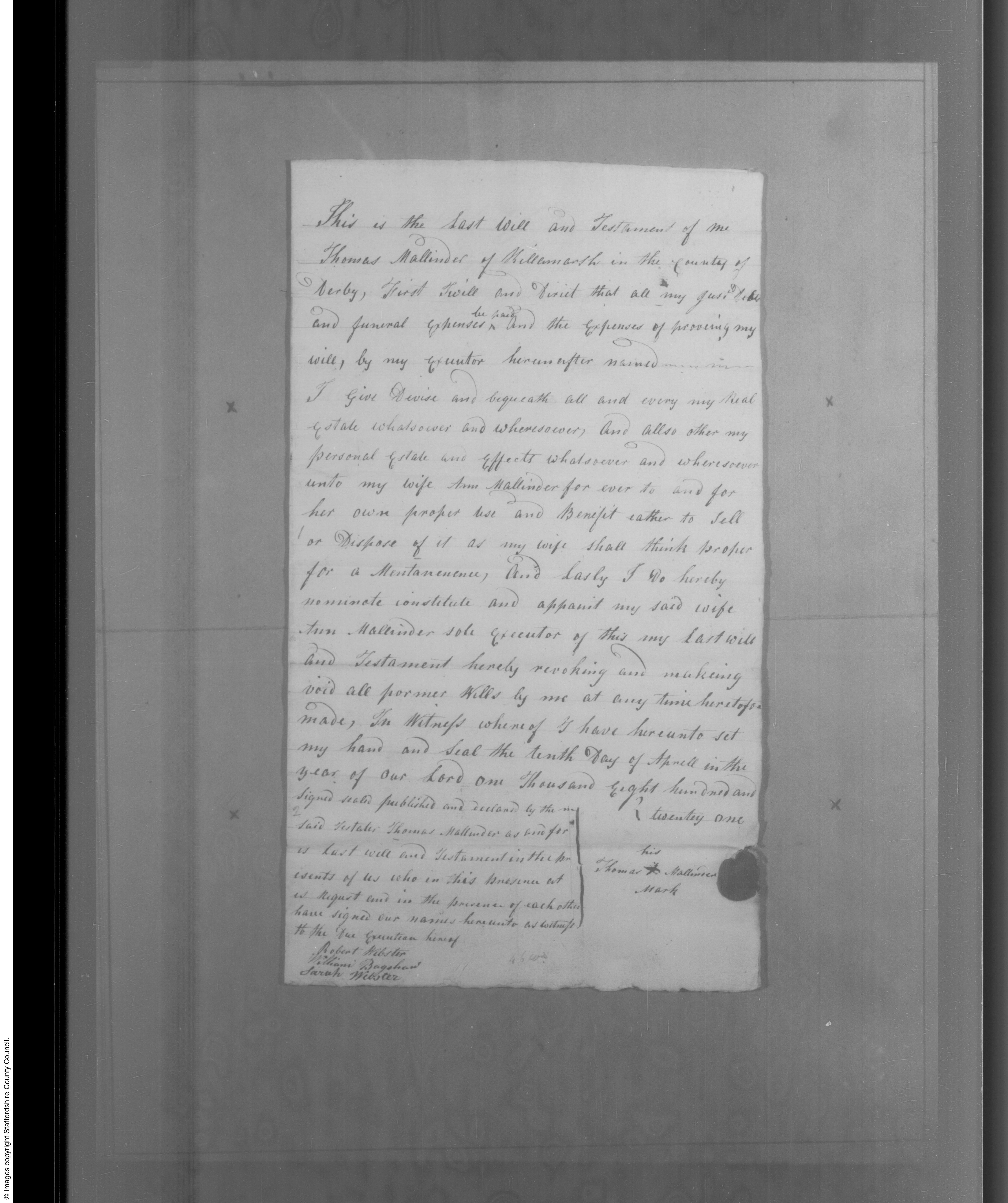 There is a grant of probate given to Ann Mallinder on 18th October 1821 for the will of Thomas Mallinder. The probate is under the value of £100 therefore would not be liable for taxation. Ann signs with her mark, and her deceased husband is listed as a Collier.